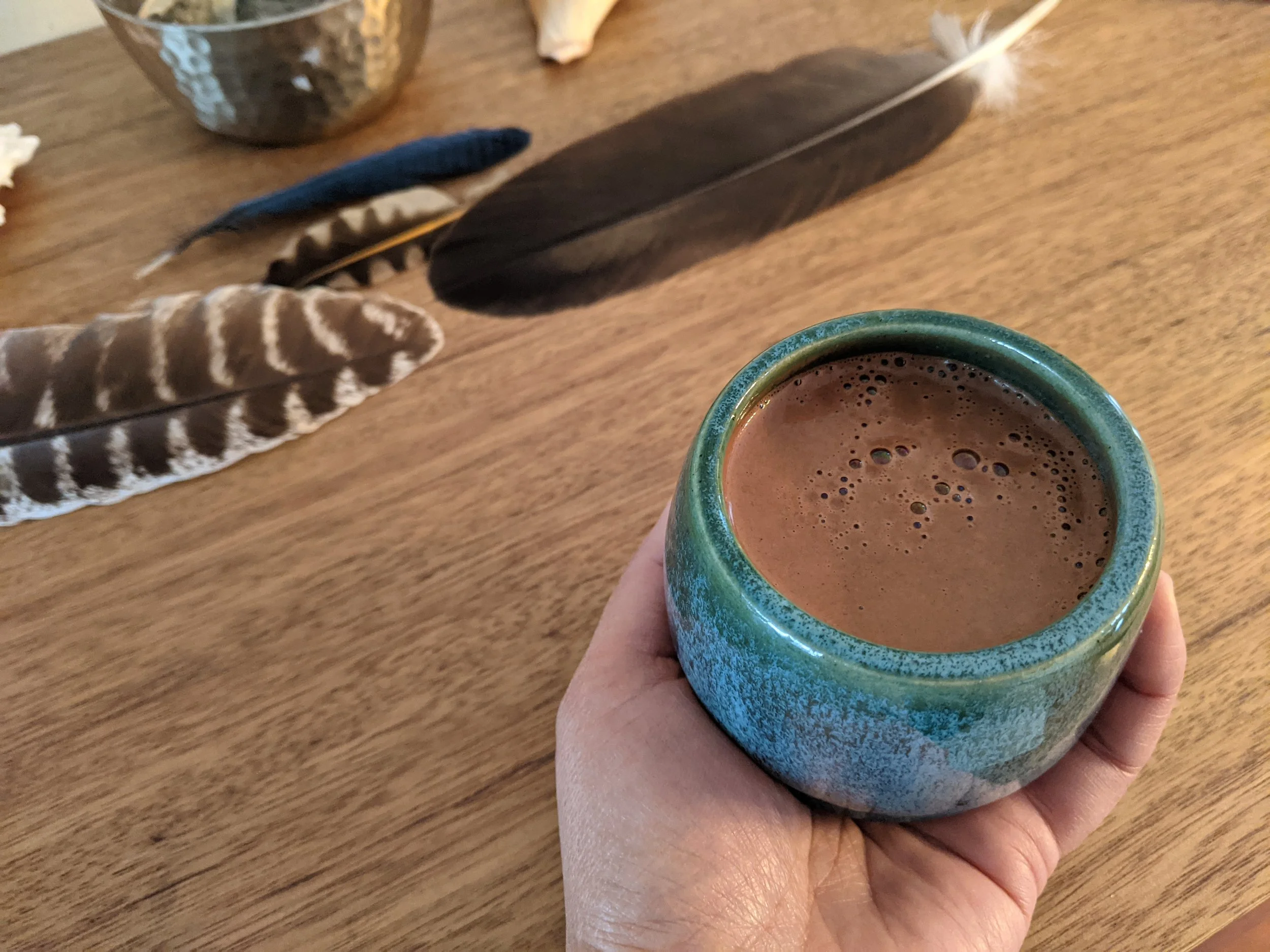 Before you take your first sip, welcome the cacao into your body either verbally or silently. Prepare your body, mind, and soul to receive it with reverence.